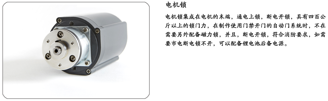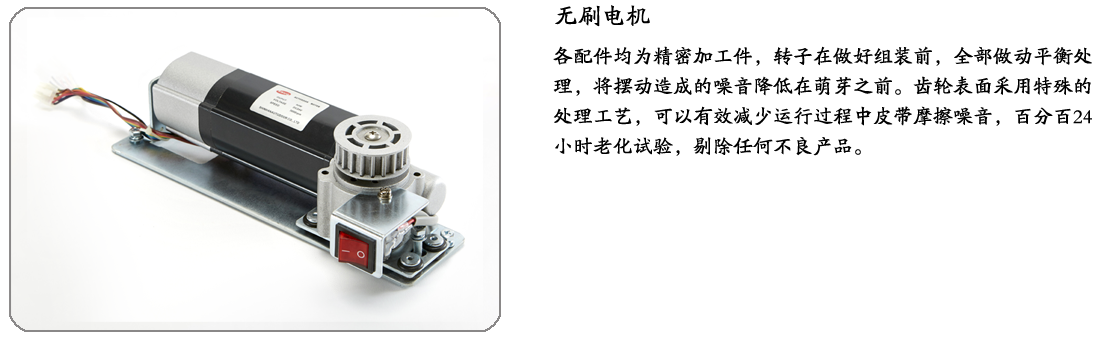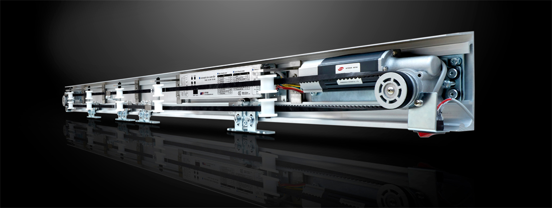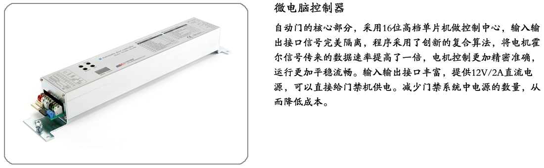 SG-900R弧形自動門機組,采用T6063鋁合金軌道,精密拉彎成型,配備精密加工的吊掛件,獨特的設計滾輪,使門扇類似于直線運行,多點皮帶支撐輪,輪子采用聚甲醛塑料精密加工。配備90W大功率直流無刷電機,配合先進的控制器系統,運行流暢、噪音低、安全可靠。